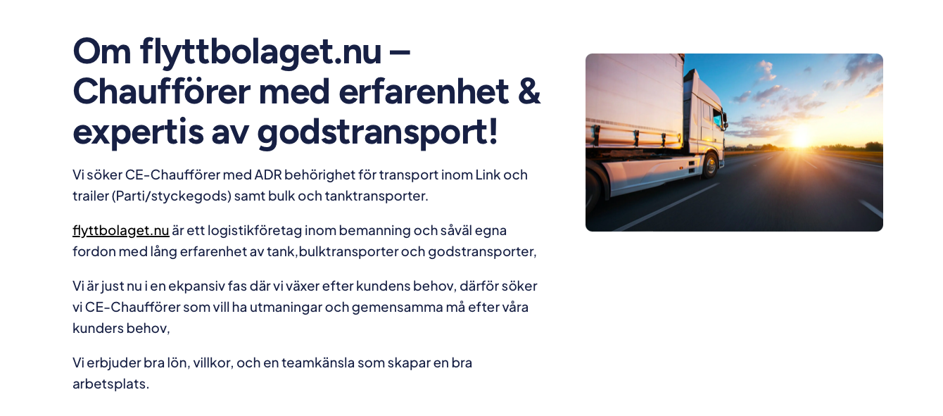 Aktuella tjänster avser CE-chafförer för bemanning av dragbil, link - trailer (styckegods) samt dragbil, tanktrailer/bulktrailer-transporter.